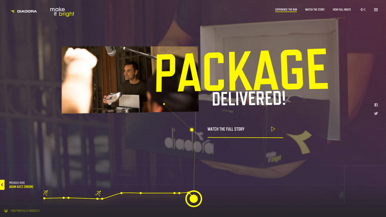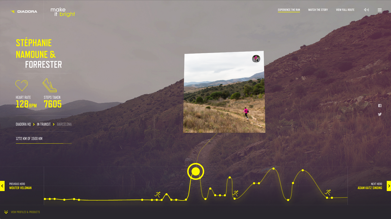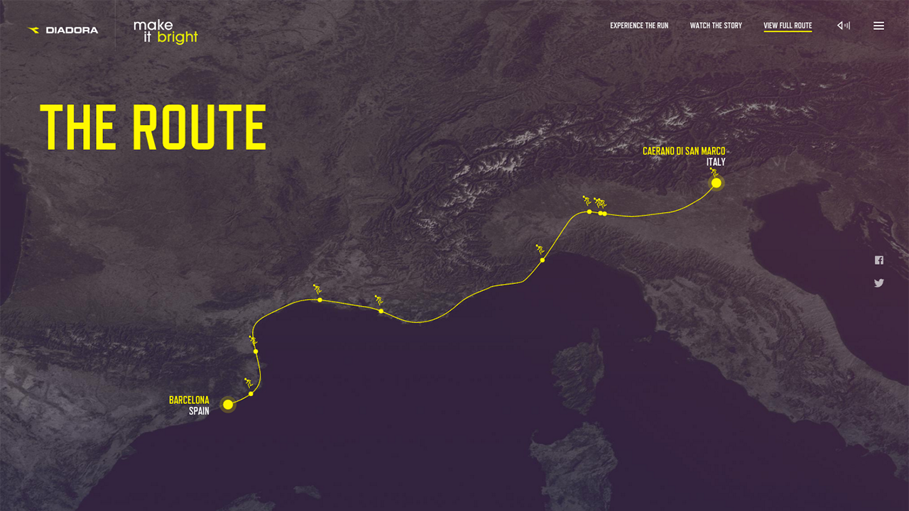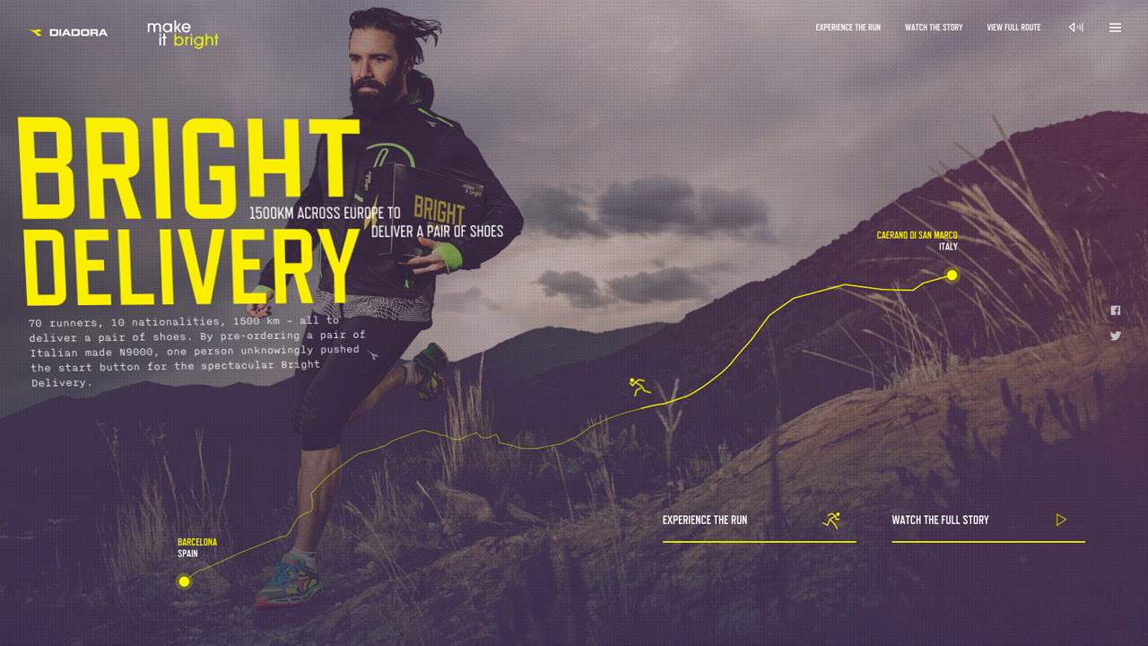Italian sporting icon Diadora celebrates the launch of its Make It Bright campaign with a 1500km relay across Europe. 70 runners, chosen from among 1,000-plus applicants, carried a a box of shoes from the Diadora Headquarters in Caerano di San Marco in Italy all the way to Barcelona, Spain, in a feat of endurance to highlight the brand’s attitude towards turning the ordinary into the extraordinary. The shoe being delivered, the N9000 ITA, was itself once a stalwart of high performance sportswear, launched in 1990 and worn by sporting icons of the era.